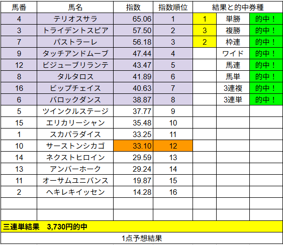 また、1点予想は単勝が1的中とこちらは一息となりました。