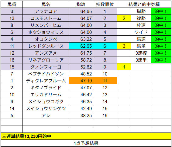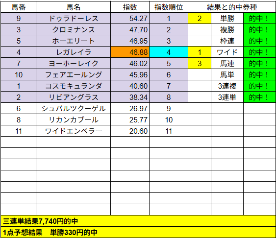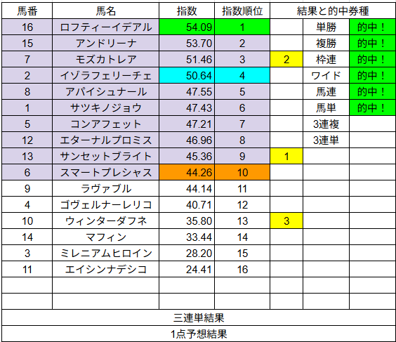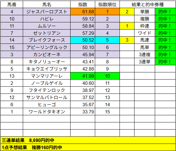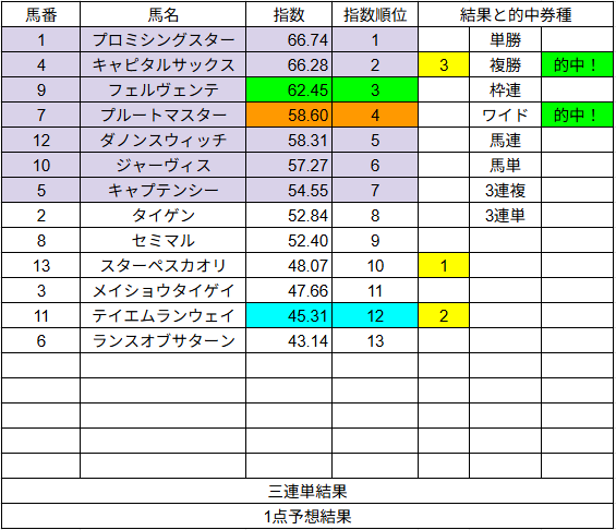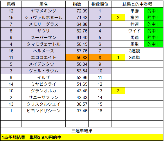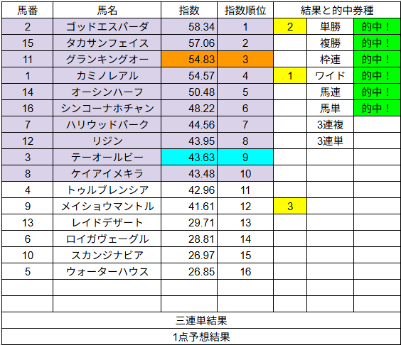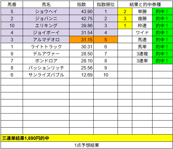 1点予想は3的中と的中率もよく、配当も単勝29倍が的中しています。