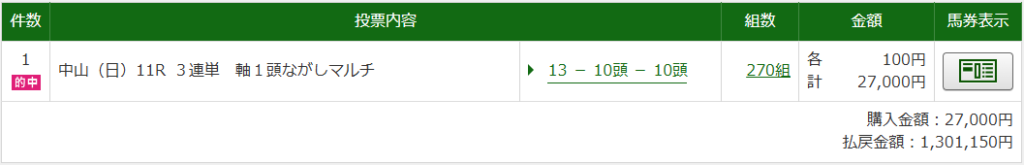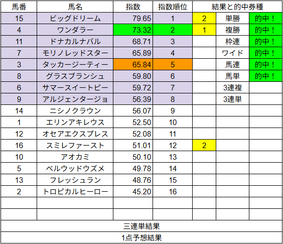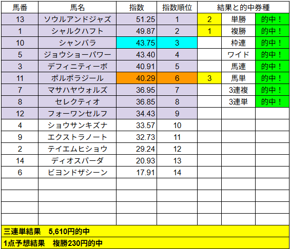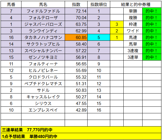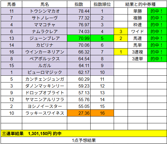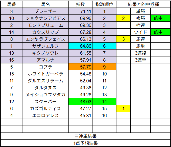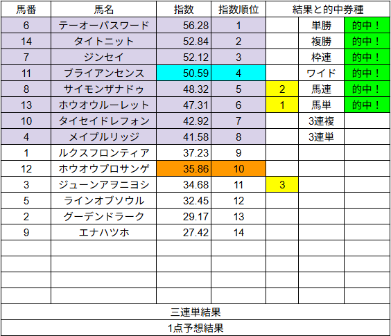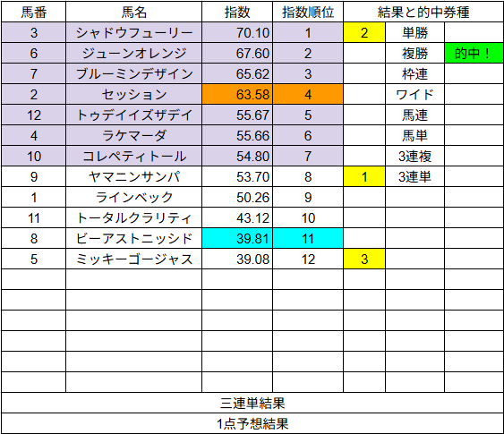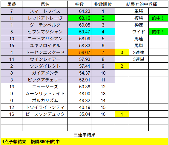 1点予想も単勝を含む3的中と的中率と配当共に良く、