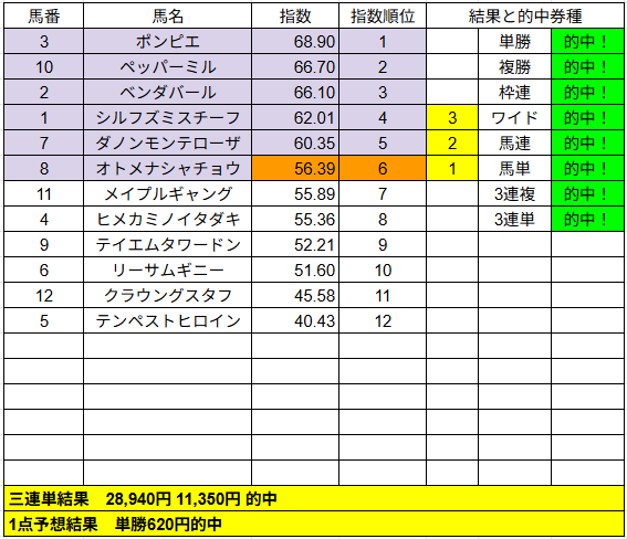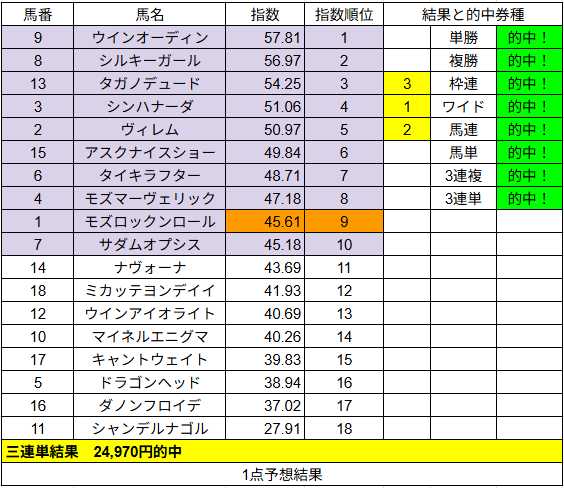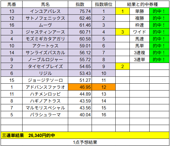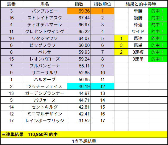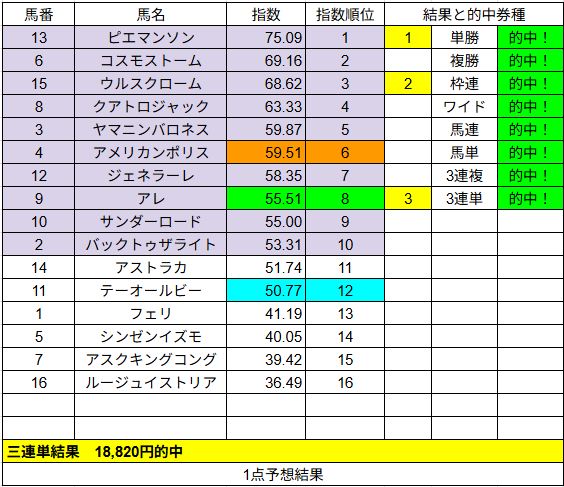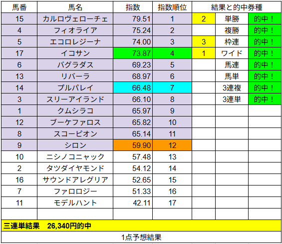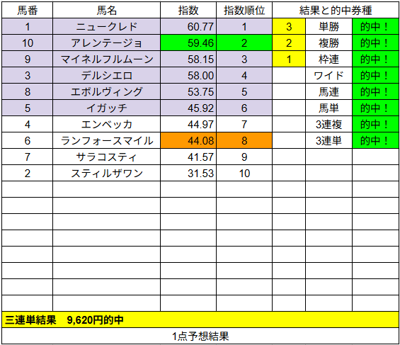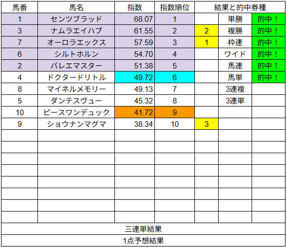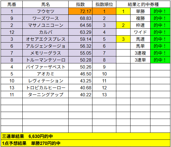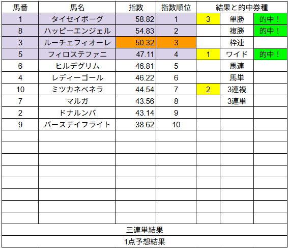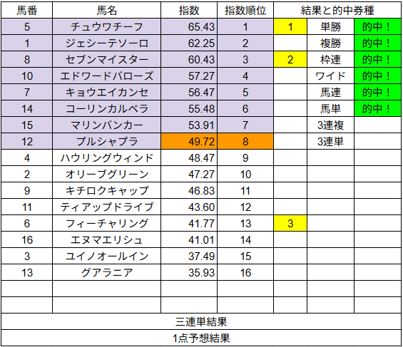 1点予想は単勝が2的中でした。1点予想はまずまずですね。
