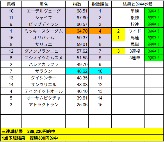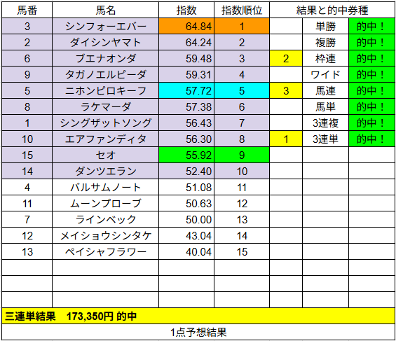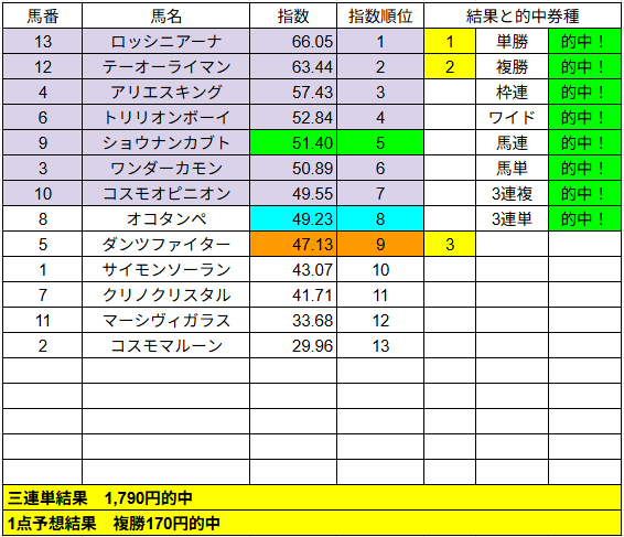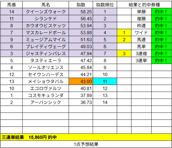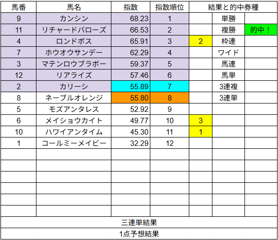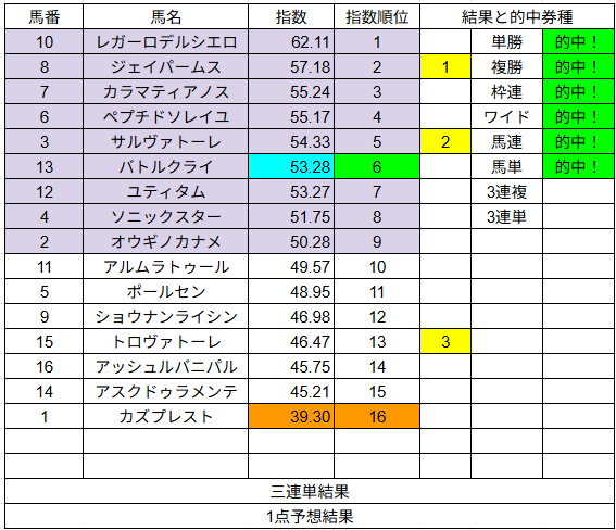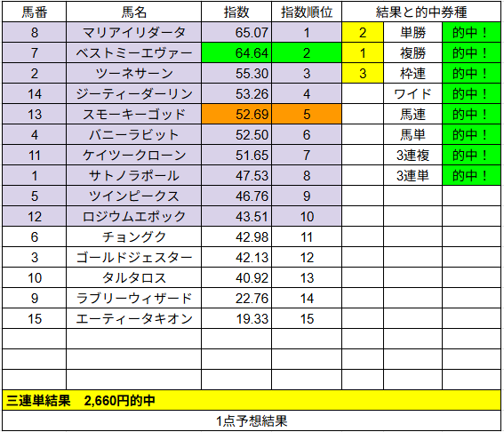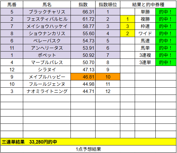 1点予想は複勝が2的中でした。こちらはいまいちでしたね。