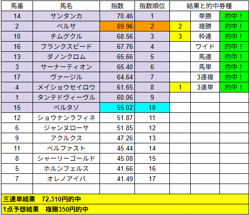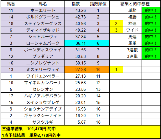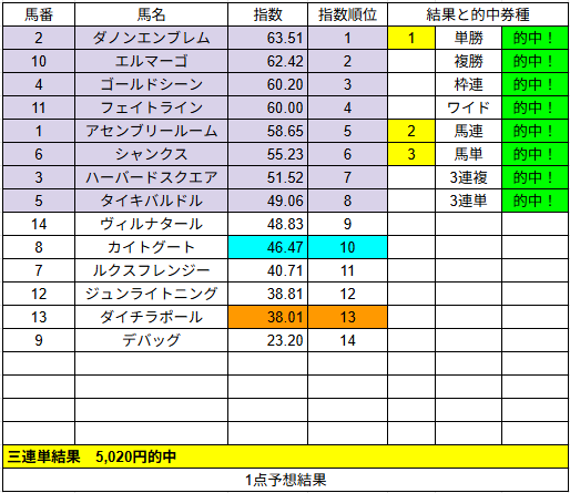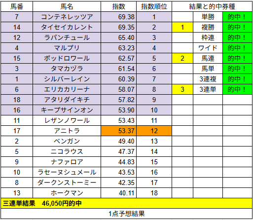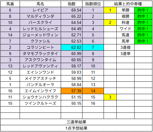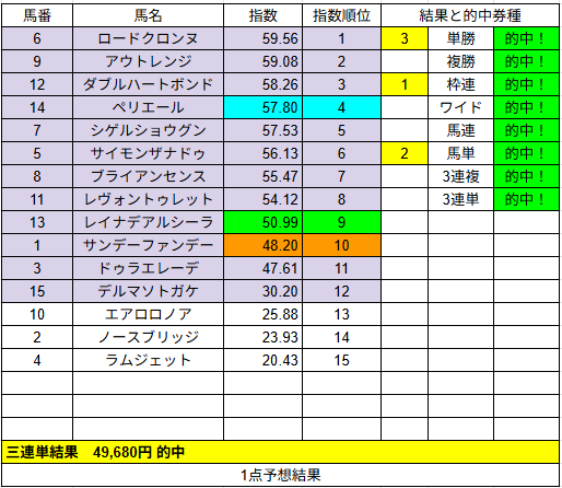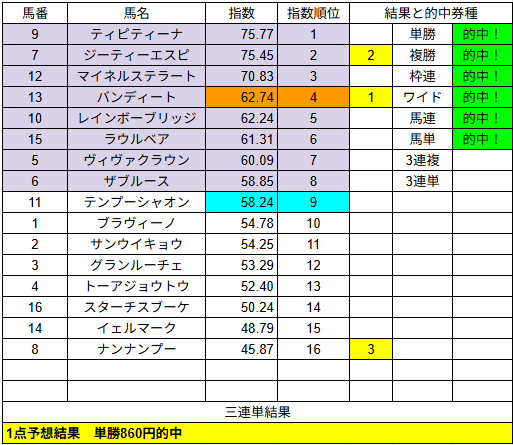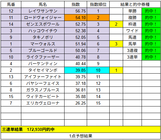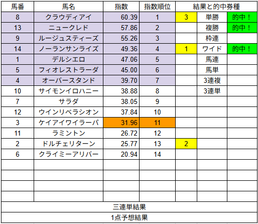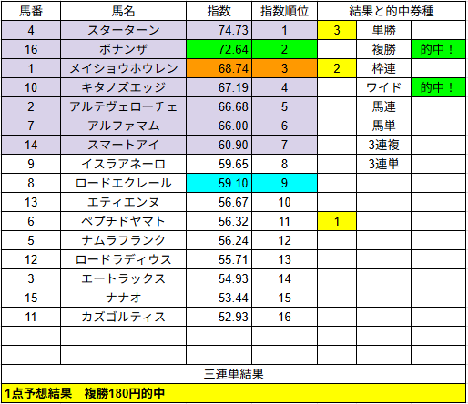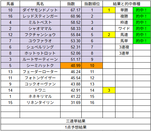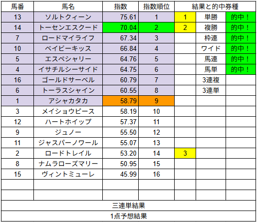 1点予想は単勝が2本、複勝2本とこちらも非常に好調でした。