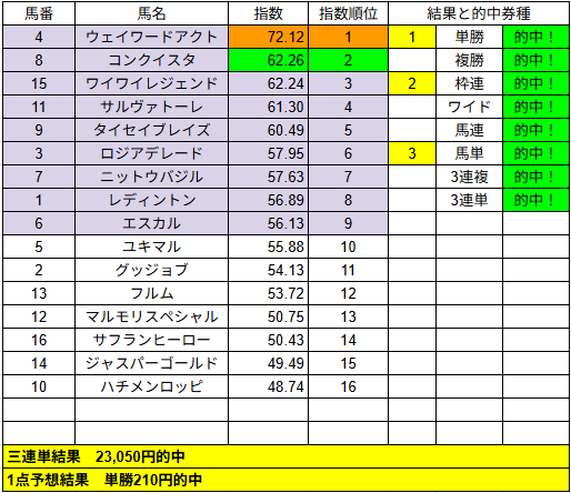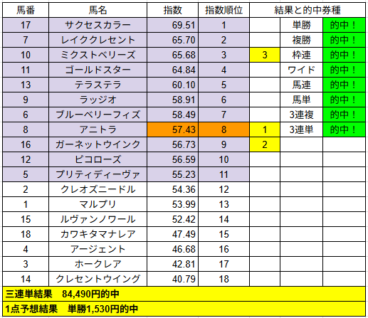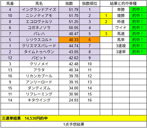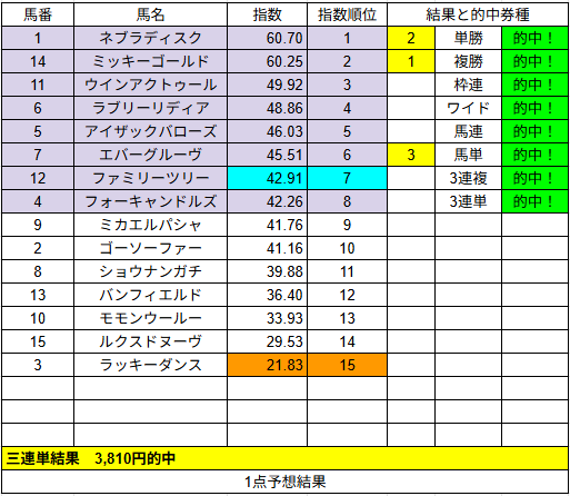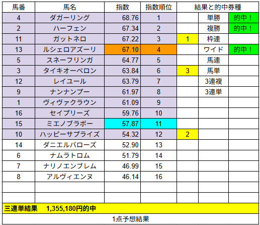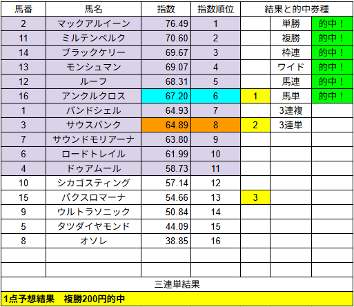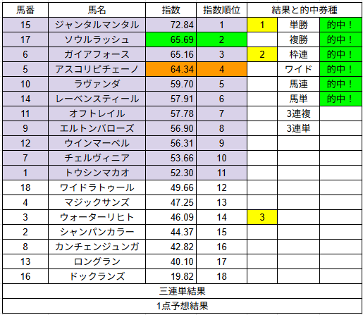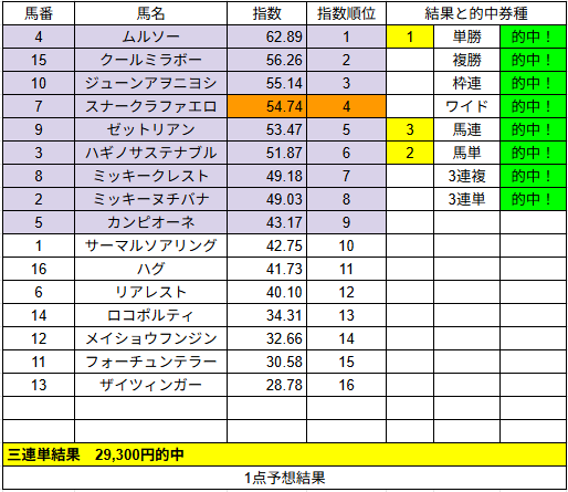 1点予想も単勝1530円を含む3的中と1点予想も的中率、配当ともに絶好調でしたね。