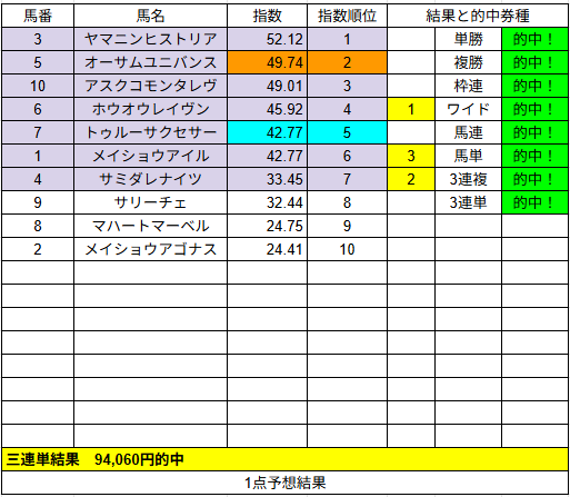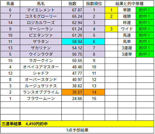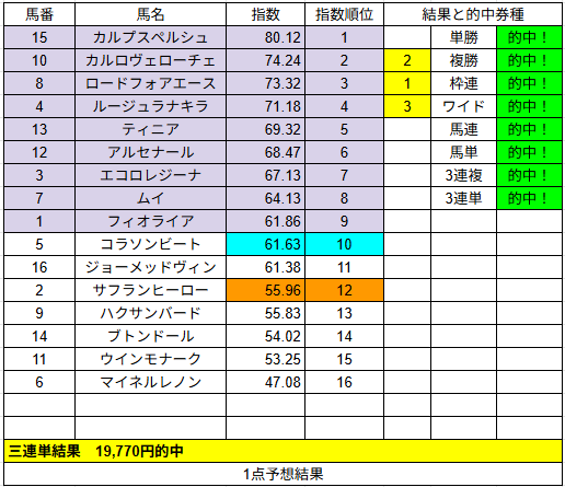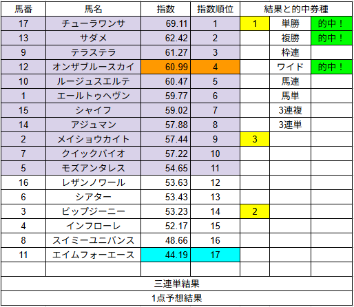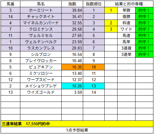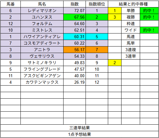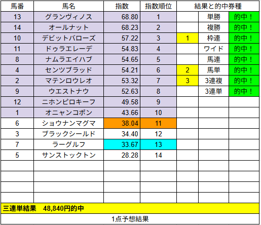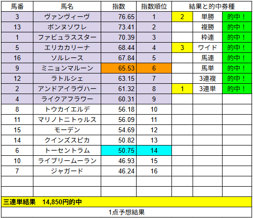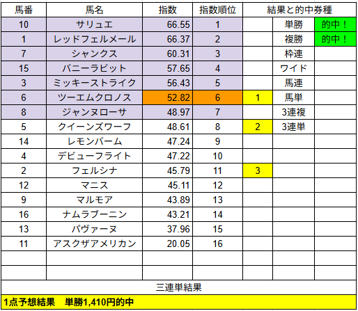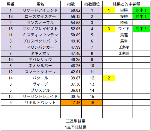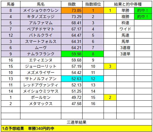 1点予想は単勝2的中でした。こちらは単勝14倍が的中しています。