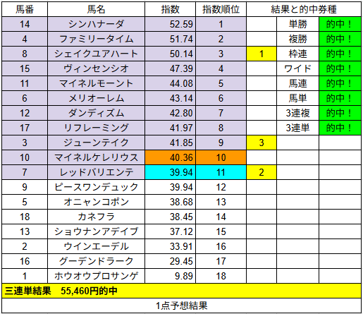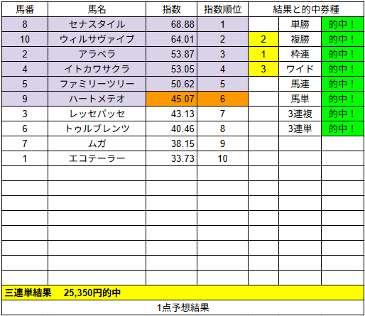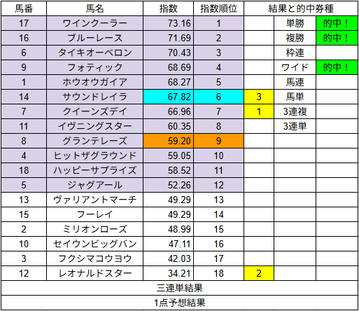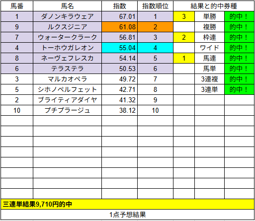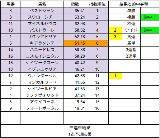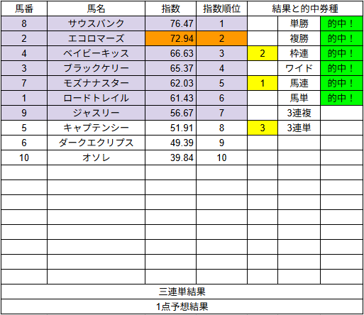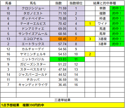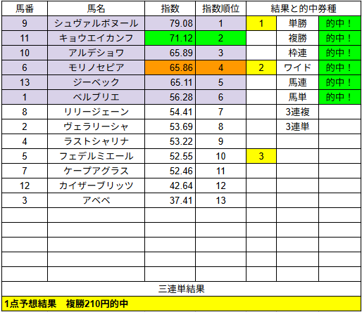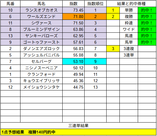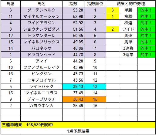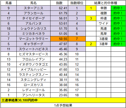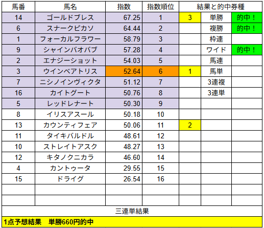 1点予想は4的中で単勝も1本的中しています。こちらは好調維持です。