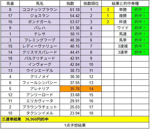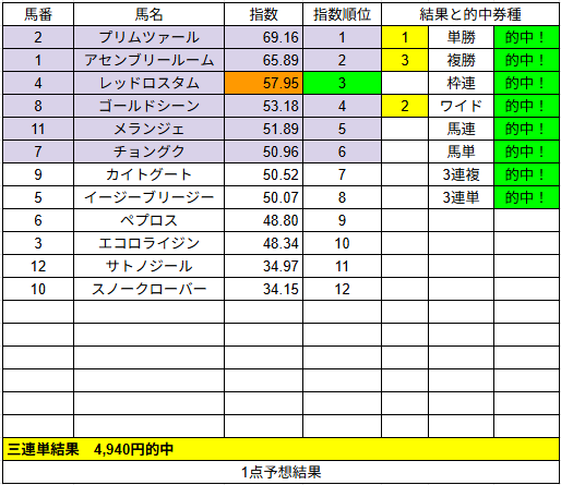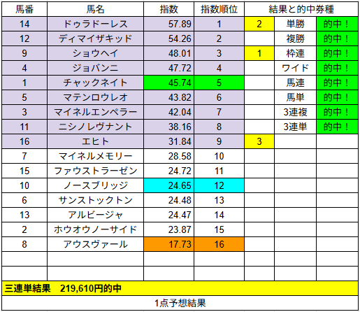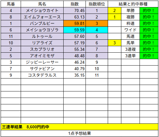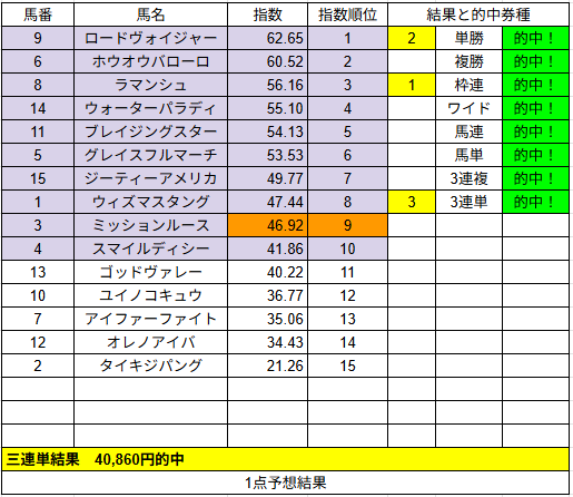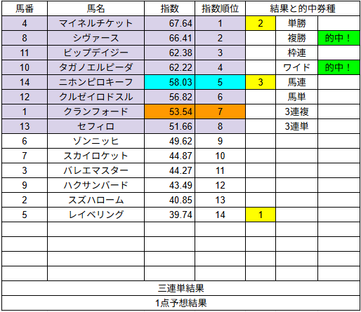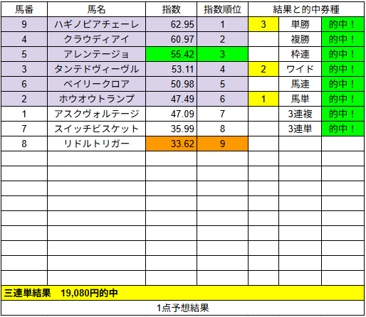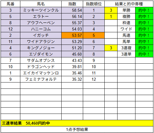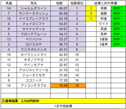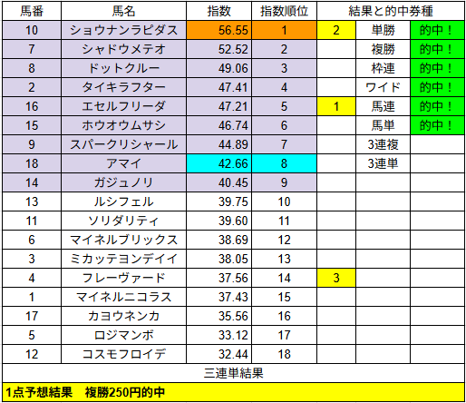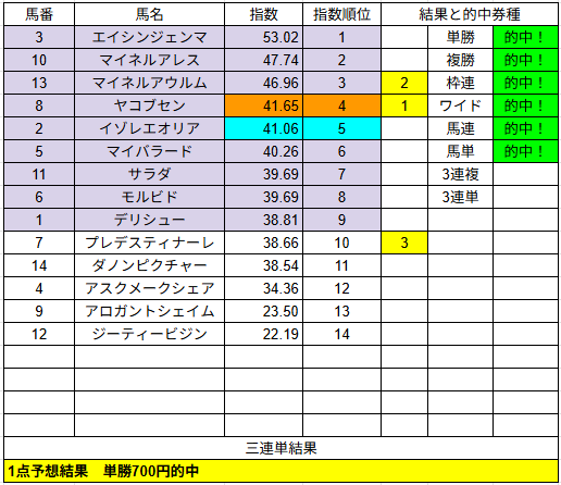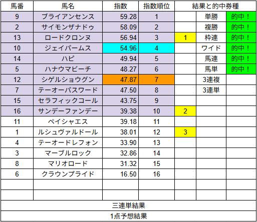1点予想は単勝を含む2的中でした。こちらは一息ですね。