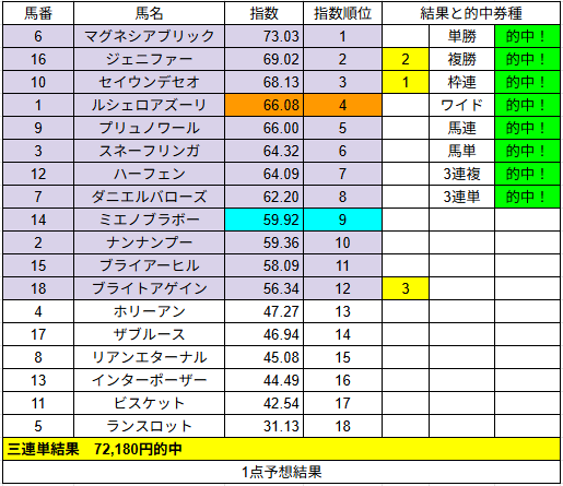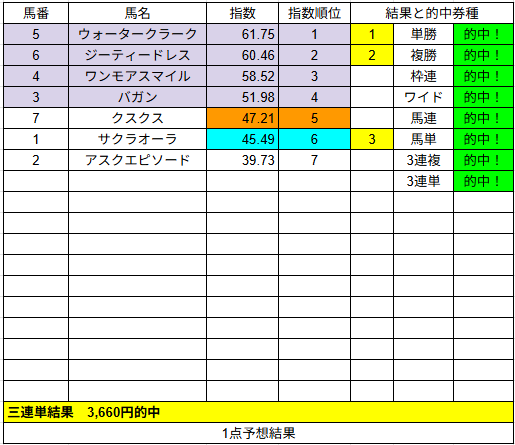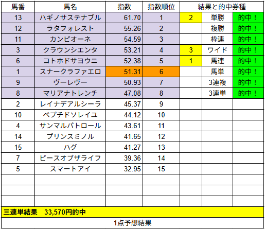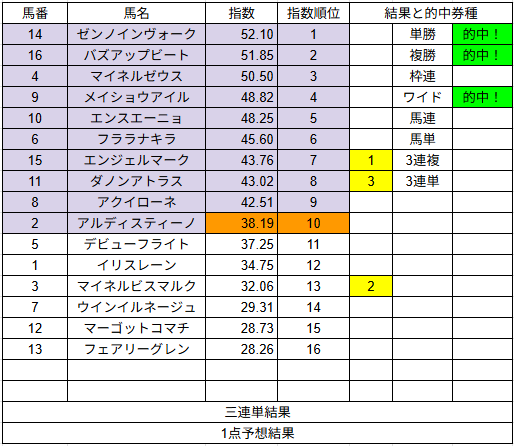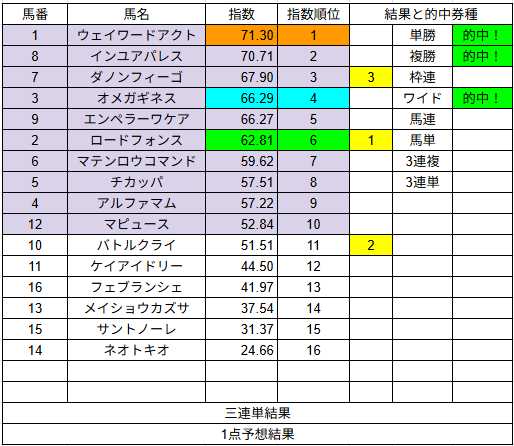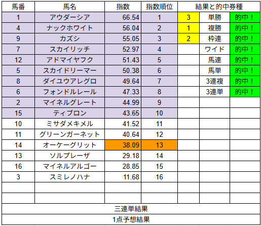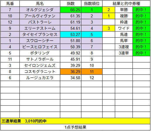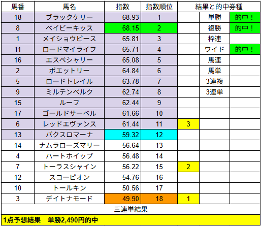 1点予想は単勝1的中だけでしたが配当は2,490円でした。