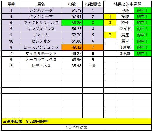 馬券の的中は紫色の推奨馬の結果です。
