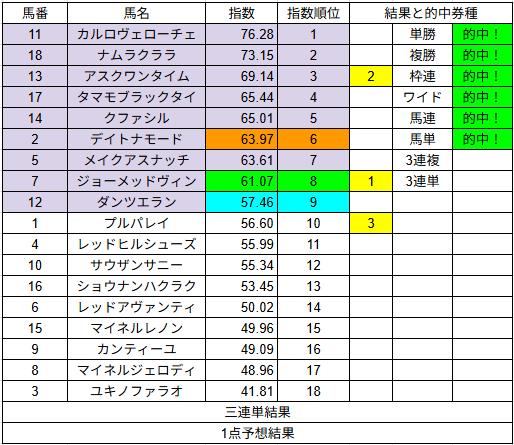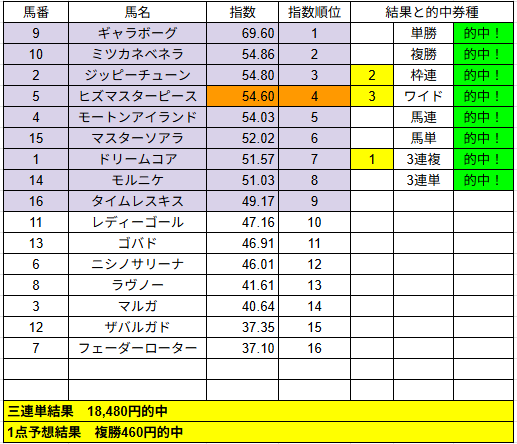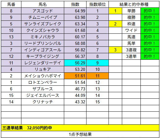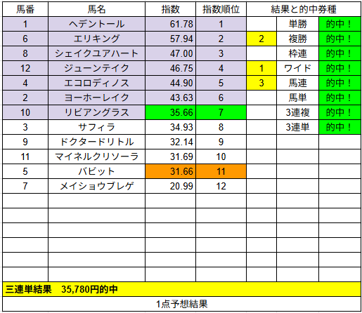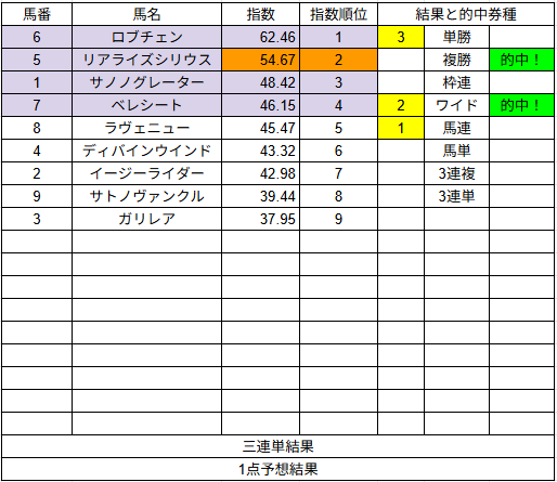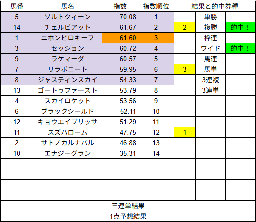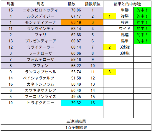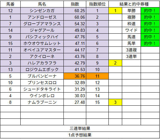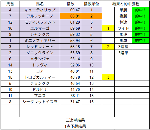 1点予想も複勝3的中とまずまずでした。来週もご期待ください。