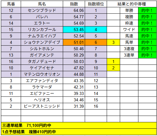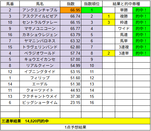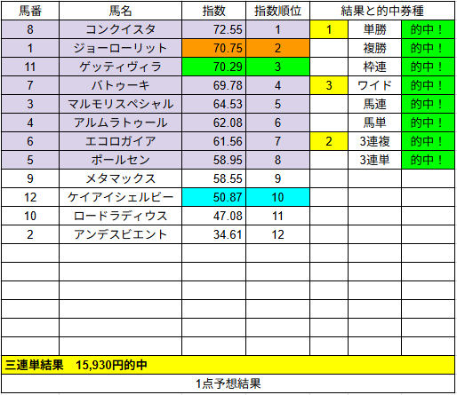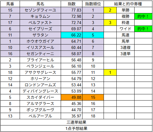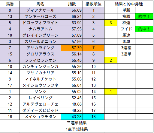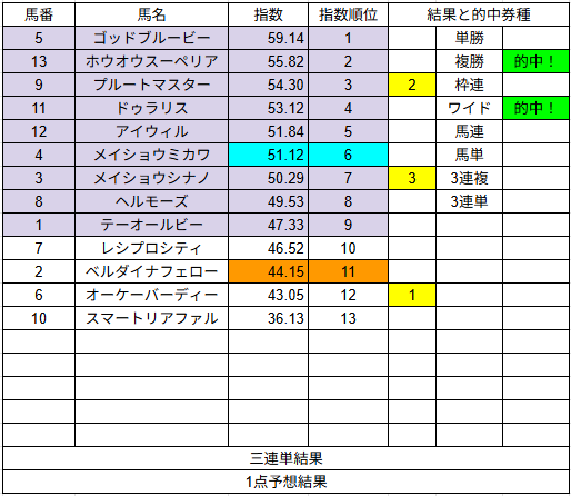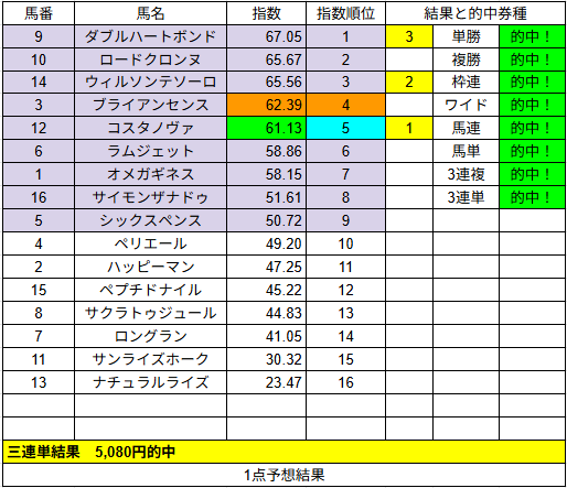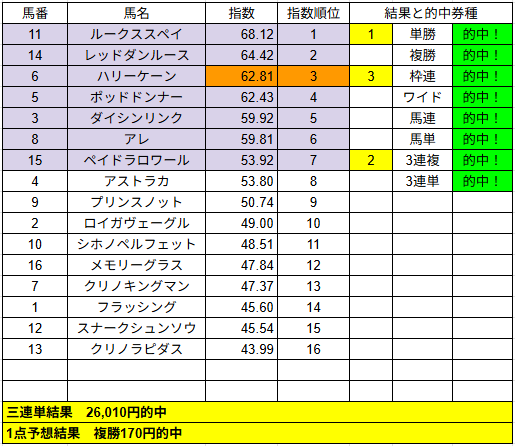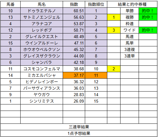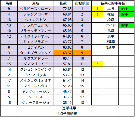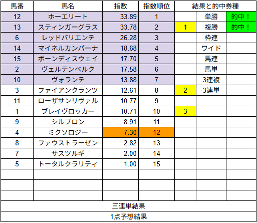 1点予想は複勝2的中とこちらは一息でした。来週の巻き返しにご期待ください。